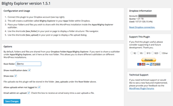 تتميز الإضافة بمستعرض سهل الاستخدام للمجلدات/الملفات يعكس هيكل حساب Dropbox، ويقدم خيارات لعرض أحجام الملفات وتواريخها. كما تدعم أيضًا تحميل الملفات إلى مجلد مخفي محدد أو المجلد المعروض حاليًا في Dropbox. بالإضافة إلى ذلك، يمكن للمستخدمين تعيين حقوق الوصول لكل مجلد فرعي من المستوى الأعلى والاستمتاع بالتوافق مع مجموعة متنوعة من إضافات الصور من نوع lightbox، مما يعزز تجربة المستخدم بشكل عام.